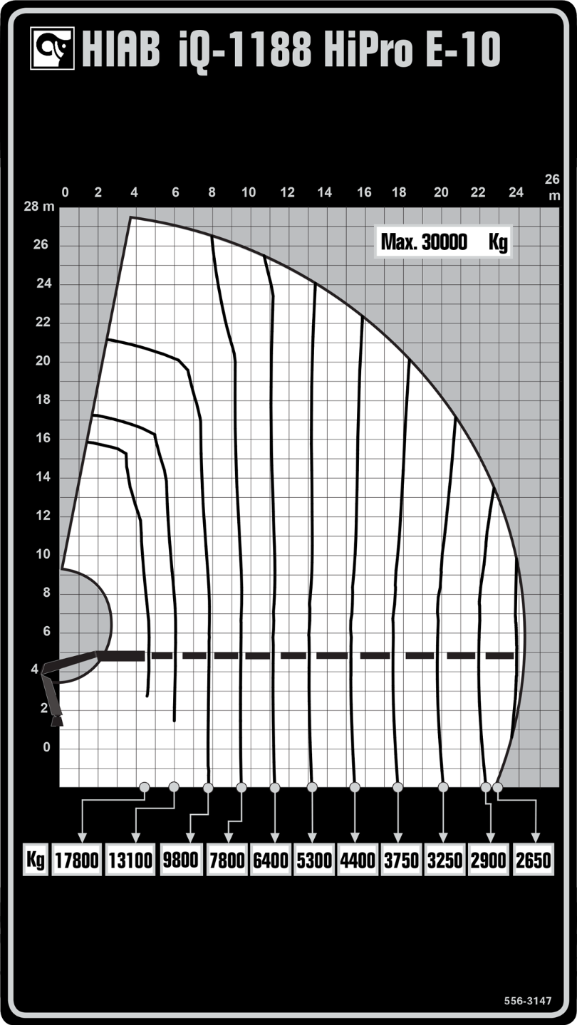 The Hiab 1188 HiPro is a powerful folding boom truck used for heavy lifting and transportation tasks. This truck has a lifting capacity of up to 40 tons, making it a versatile vehicle for a variety of industries. It is equipped with a hydraulic crane system that offers precise control and smooth operation, allowing for safe and efficient movements of heavy loads.